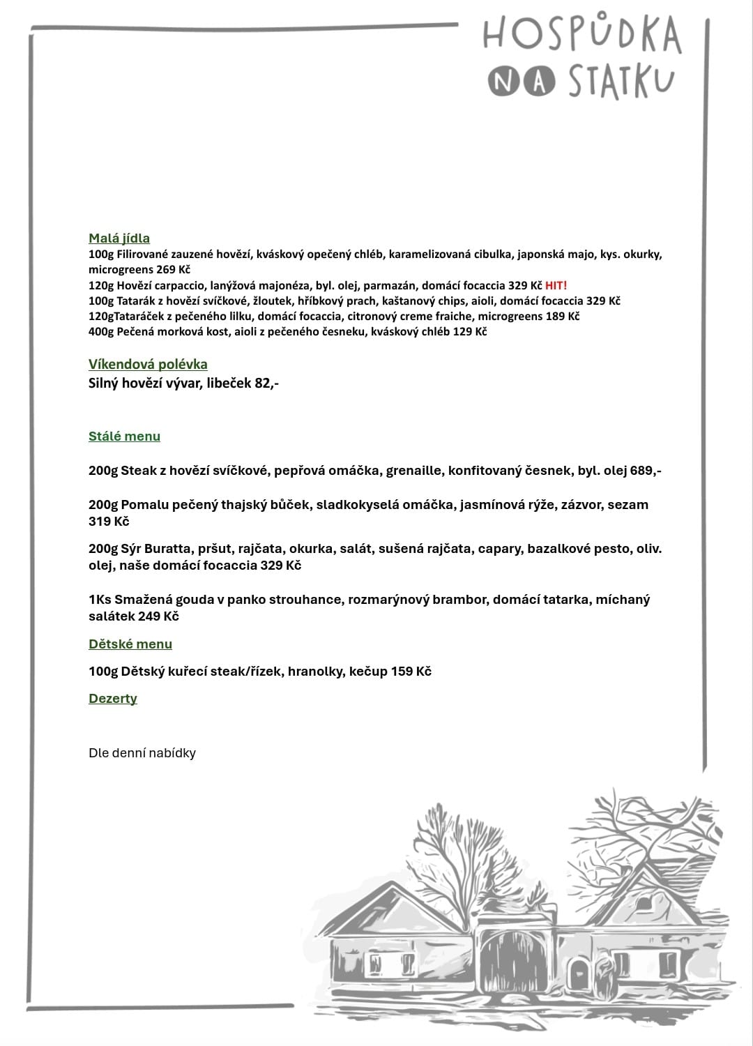 Všichni v Hospůdka Na Statku vás v Letkově vřele vítáme! Těšíme se, až vás přivítáme v našem steakhouse. Čeká vás opravdová pohostinnost a skvělá nabídka mezinárodní kuchyně. Chutné pokrmy připravují naši nejlepší šéfkuchaři. Posaďte se a vychutnejte si naše mistrně připravené jídlo, které uspokojí všechny chutě. Pokud máte rádi sladké, potěší vás naše lahodné dezerty. Dokážeme uspokojit i ty nejrůznější dietní preference a nabízíme širokou škálu bezlepkových, bezlaktózových, veganských a vegetariánských možností. K jídlu si můžete dát i osvěžující pivo, víno, kávu a čaj. Naši ochotní číšníci na vás čekají a potěší vás chutnými pokrmy. Kromě skvělé obsluhy máme k dispozici příjemnou živou hudbu, pivní zahrádku a hudbu.